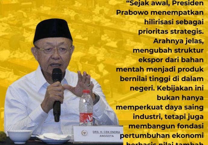 “Sejak awal, Presiden Prabowo menempatkan hilirisasi sebagai prioritas strategis. Arahnya jelas, mengubah struktur ekspor dari bahan mentah menjadi produk bernilai tinggi di dalam negeri,” kata Cek Endra, Sabtu (16/8/2025).