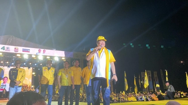 Ketua Umum Golkar, Airlangga Hartarto menghadiri kegiatan Kampanye Akbar Partai Golkar di lapangan panahan, Stadion Pakansari, Cibinong, Kabupaten Bogor, Jawa Barat, Rabu (7/2/2024).