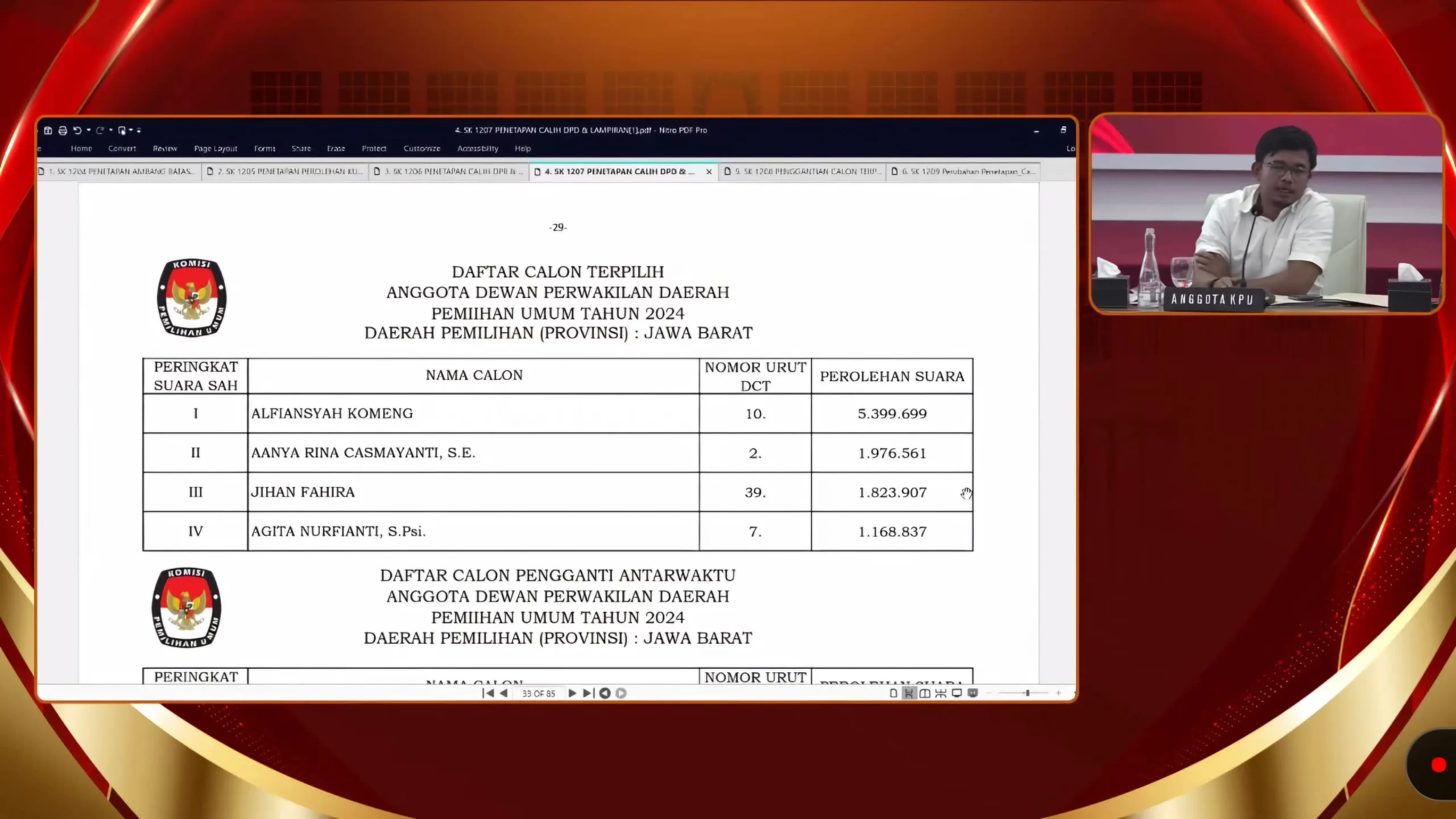 “Daerah Pemilihan (Dapil) Jawa Barat. Peringkat suara sah ke-1 Alfiansyah Komeng,” ujar Idham di ruang rapat pleno kantor KPU RI.