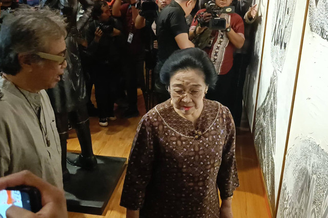Ketua Umum PDIP Megawati Soekarnoputri menyambangi pameran seni rupa bertajuk “Melik Nggendong Lali” karya Butet Kartaradjasa di Galeri Indonesia Nasional (Galnas), Jakarta Pusat, Senin (13/5).