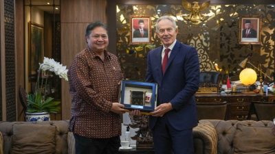 Menteri Koordinator Bidang Perekonomian Airlangga Hartarto dan mantan Perdana Menterin (PM) Inggris Tony Blair melakukan…