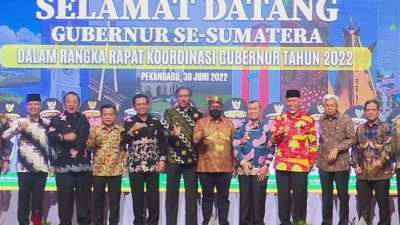 Gubernur Riau Syamsuar mepaparkan sembilan permasalahan yang ada di Pulau Sumatera saat rapat koordinasi (rakor)…