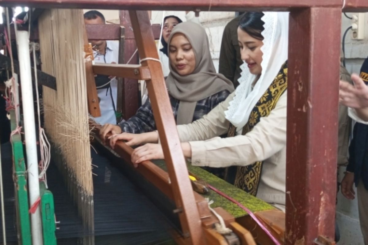 Dalam kunjungan tersebut, Dyah terlihat terkesima saat menyaksikan para wanita yang tengah membuat kain tenun secara manual menggunakan alat tenun tradisional.